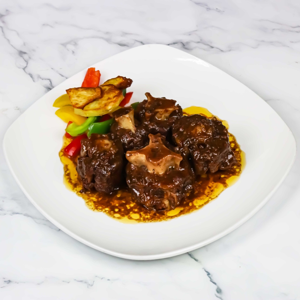 Rabo de toro 94%, agua, almidones modificados, azúcar, aromas, caramelo de azúcar, sal, especias, tomate, extractos vegetales y de especias, hierbas aromáticas, jarabe de glucosa, dextrosa, aceite de girasol, ajo (ajo morado, sal, corrector de acidez (ácido cítrico)), cebolla y pimienta negra.